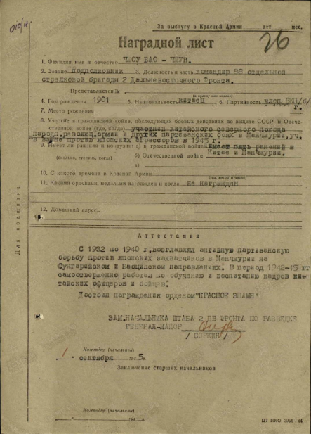图4.周保中(黄绍元)的亲笔自述(上)及苏联政府授予他红旗勋章和苏军中校军衔的登记表(下)